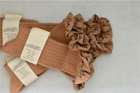 Apolline_Gingham Ruffle Ribbed Knee-high Socks_Caramel au Beurre Salé