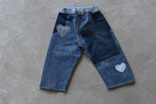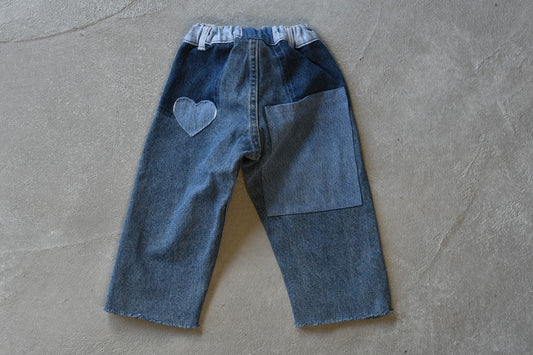 時を超えて一人一人の物語が刻まれていくデニム。Wunderlangはリーバイスのリサイクルデニムを使用し、複数のデニムを繋ぎ合わせ、世界で一つだけのデニムへと蘇らせています。ウォッシュ加工が施されており、ワイドなクロップドレッグと伸縮性のあるウエストバンドでリラックスフィットのスタイルは小さなお子様でも着やすく心地のよさを感じていただけます。
